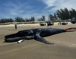 Baleia-jubarte de 8,5 metros é encontrada morta na praia do Balneário Esplanada, em Jaguaruna