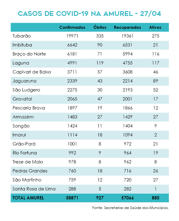 Desde o inicio da pandemia, 58.871 moradores da Amurel contraíram o coronavírus, sendo que 97% deles já se recuperaram. No entanto, 927 pessoas não resistiram às complicações causadas pelo vírus. Nesta terça foram registradas mais oito mortes em quatro cidades.