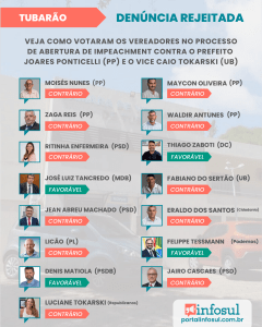 Em Tubarão, para o processo de impeachment ser aberto, são necessários oito votos favoráveis ao pedido (maioria simples). Nesta segunda apreciação, o resultado foi o mesmo do requerimento anterior: 11 x 4.
