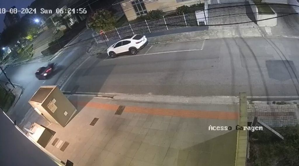 Câmeras de segurança flagraram uma colisão entre um carro e uma moto por volta das 6h30 da manhã deste domingo, dia 18 de agosto, em Tubarão.
