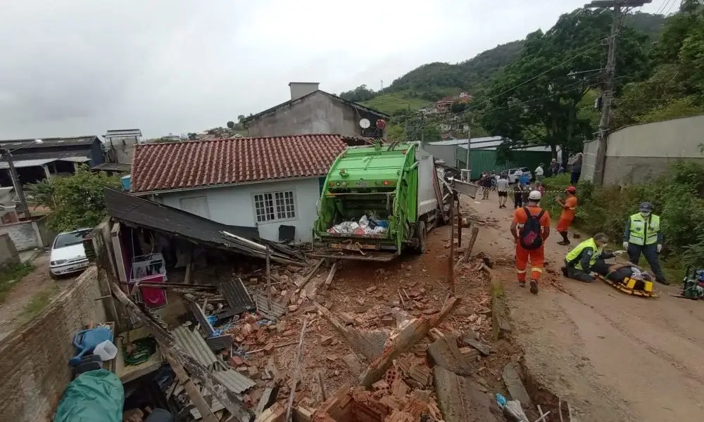 Um caminhão de coleta de lixo colidiu contra uma casa no bairro São Martinho, em Tubarão, nesta quinta-feira, 30 de outubro. No momento do acidente, nenhum morador estava na residência.