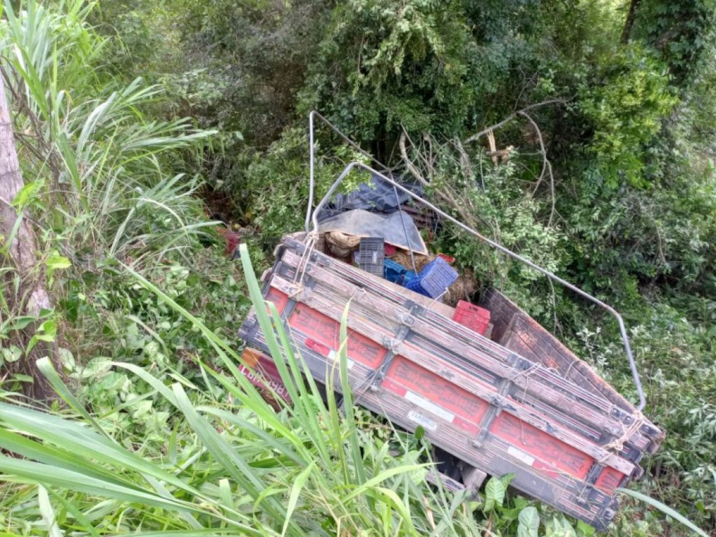 Caminhão tem problema mecânico, cai em barranco e três pessoas ficam feridas