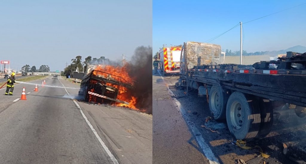 Uma carreta foi destruída pelo fogo na tarde desta quarta-feira, dia 2 de agosto, na BR-101, em Imbituba. O veículo estava carregado com bombonas de plástico e seguia no sentido Sul da rodovia.