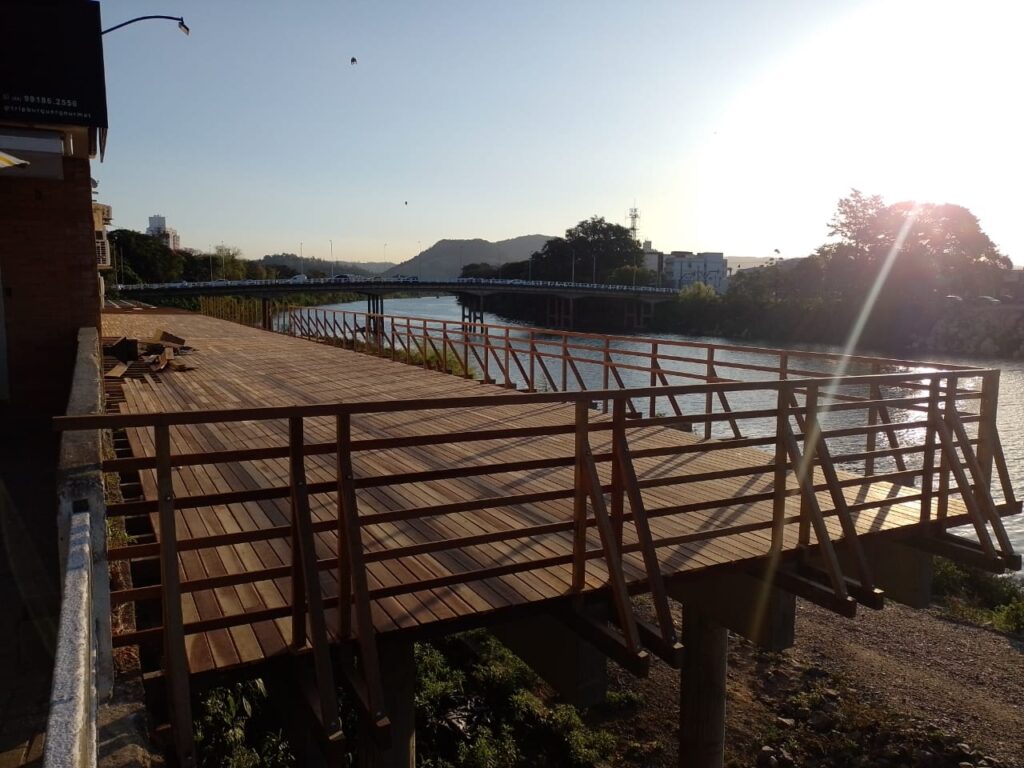 Após 18 meses do início de sua construção, ao menos 40 metros da extensão do deck erguido aos fundos do casario da rua Lauro Müller, no bairro Centro, em Tubarão, já recebeu o piso em madeira e também o guarda-corpo.