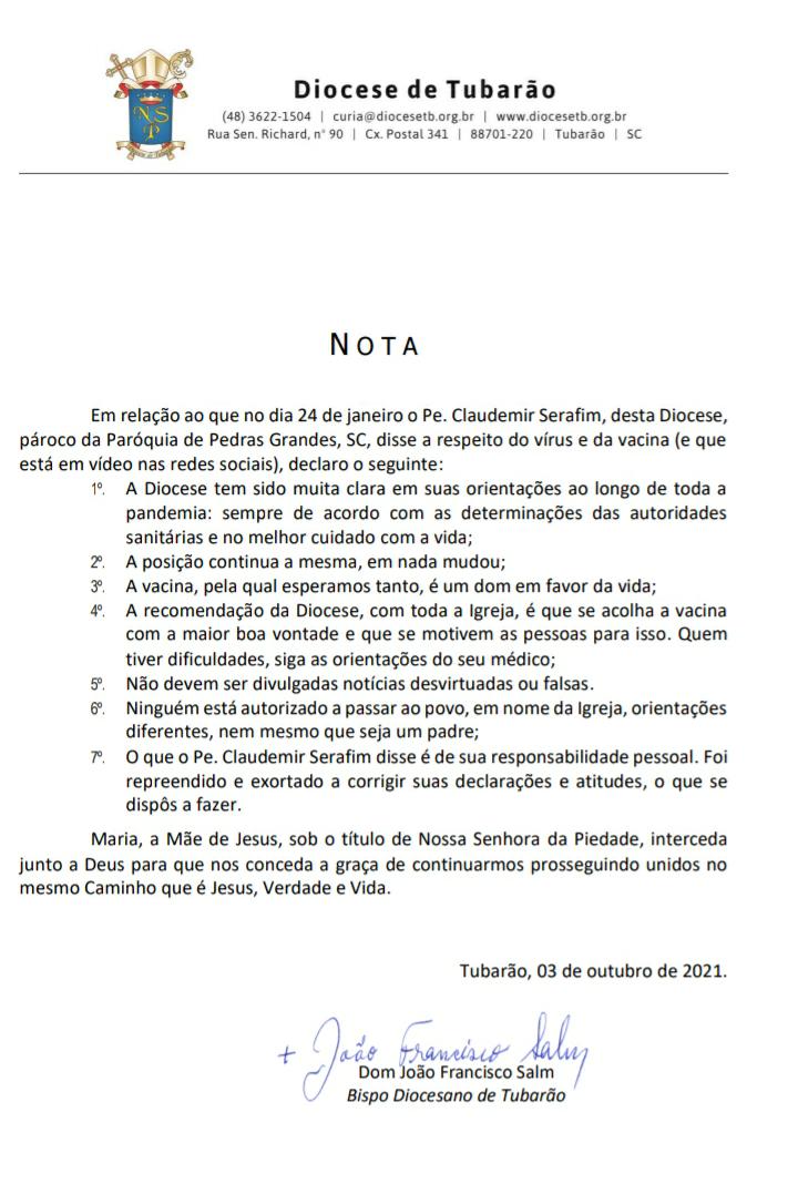 A Diocese de Tubarão, através de nota assinada pelo Bispo Dom João Francisco Salm, comentou pela primeira vez o episódio ocorrido no último domingo, dia 24 de janeiro, onde o padre de Pedras Grandes, Claudemir Serafim, disse aos fiéis que a vacina contra o novo coronavírus era produzida com fetos abortados.