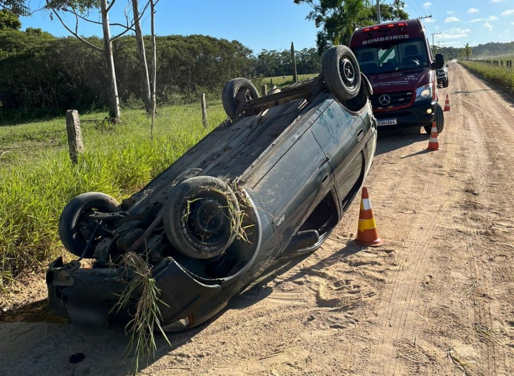 Duas pessoas ficaram feridas após o carro em que estavam capotar na estrada geral do Laranjal, em Jaguaruna, no sábado, dia 11 de março.