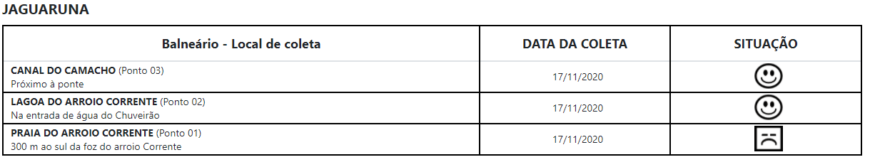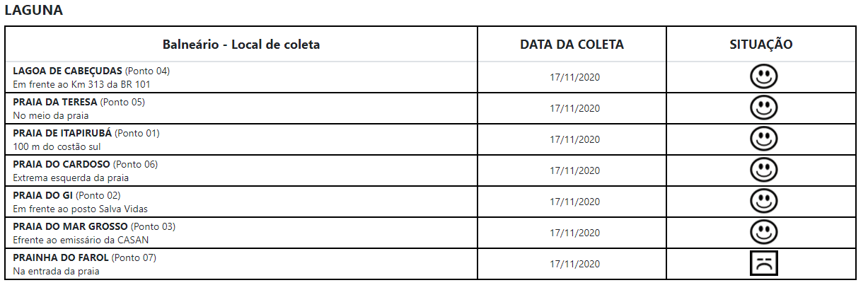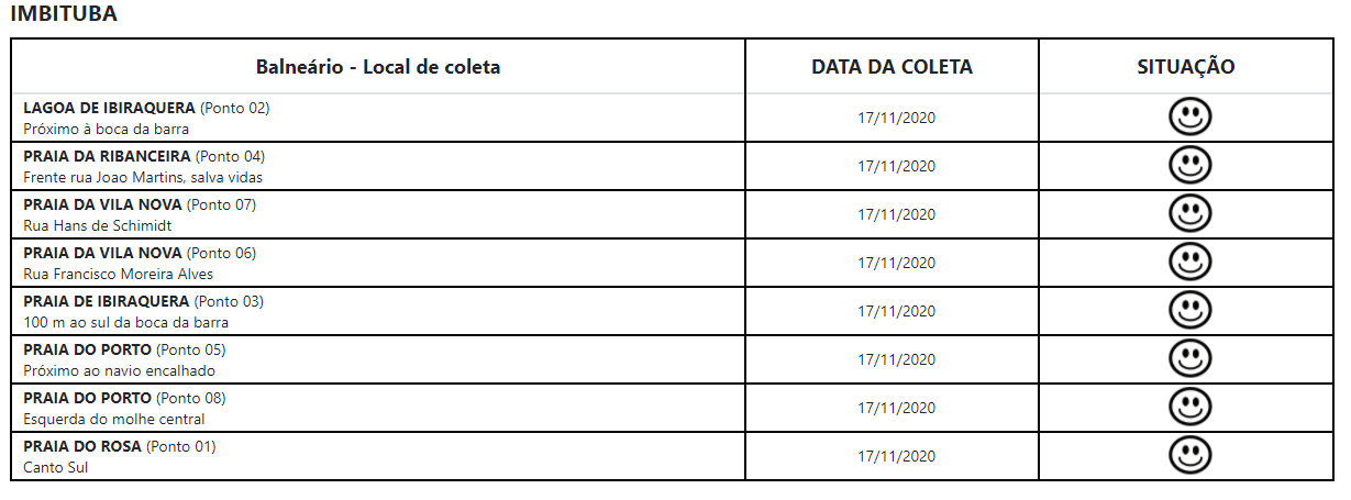 Ao todo, são coletadas amostras de 18 praias da região. Oito em Imbituba, três em Jaguaruna e sete em Laguna. As amostras foram recolhidas no dia 17 de novembro e o resultado publicado no dia 20. Confira.