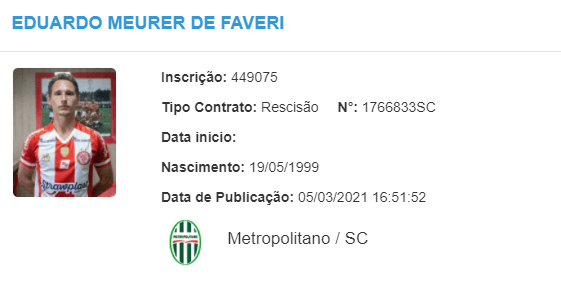 Após anunciar a contratação do atacante Luizão, o Hercílio Luz tem mais uma novidade para a disputa do Campeonato Catarinense. A diretoria colorada acertou a contratação do volante Eduardo Meurer, de 21 anos, revelado pelo Atlético Tubarão. O jogador havia acertado com o Metropolitano para a disputa do Estadual, não atuou nas primeiras rodadas e acabou optando pela rescisão do contrato. No BID da CBF, Eduardo Meurer já aparece vestindo a camisa do Leão do Sul.