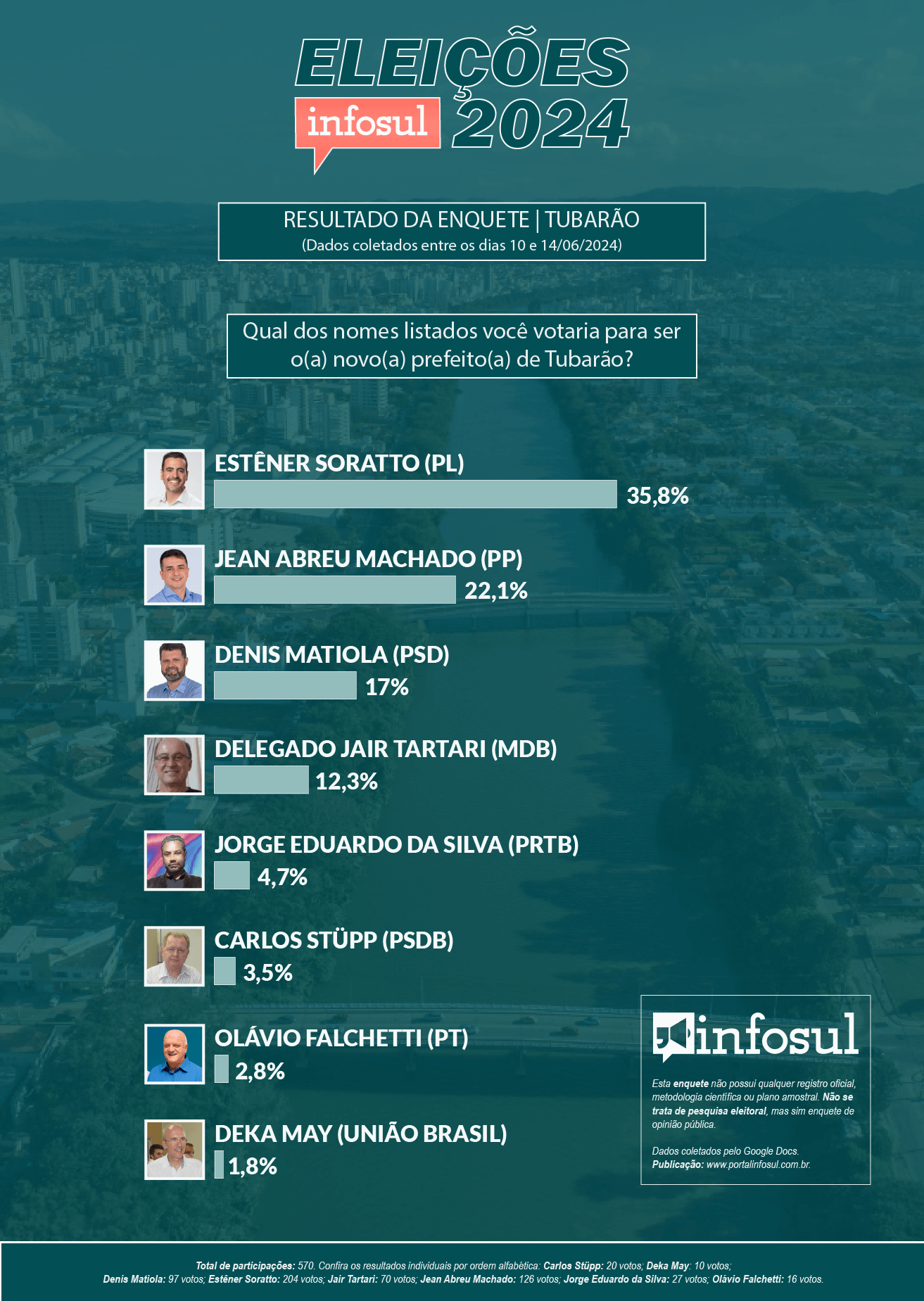 Oito nomes ventilados na imprensa para serem candidatos a prefeito de Tubarão foram colocados em votação popular, através de enquete online publicada no Portal Infosul, entre os dias 10 e 14 de junho.