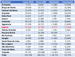 Já a cidade de Laguna foi a única que registrou queda populacional. Em 12 anos, o município deixou de ter 8.777 moradores, passando de 51.562 para 42.785 habitantes. O declínio foi de 17,02%. Isso ocorreu porque Pescaria Brava foi emancipada em 2012 e absorveu parte da população lagunense.