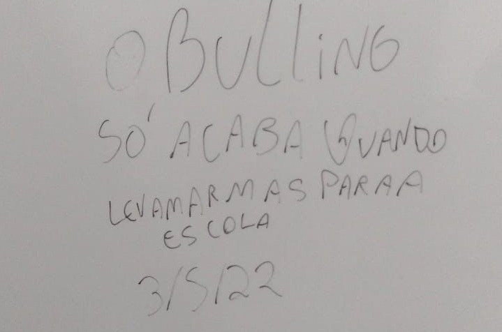 Na última quinta-feira, dia 28 de abril, alunos e professores da Escola de Educação Básica Henrique Fontes, localizada no bairro Humaitá, em Tubarão, ficaram assustados com uma mensagem deixada na parede interna do banheiro masculino: “O bulling só acaba quando levam armas para a escola – 3/5/22” [sic].