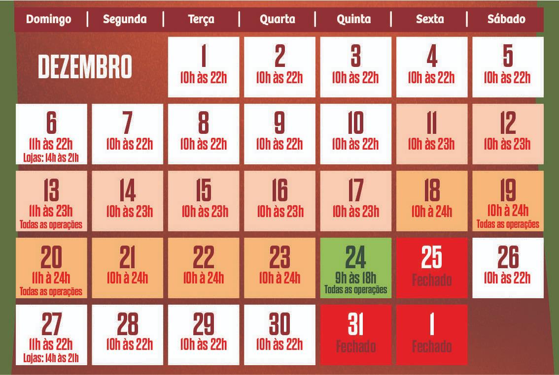 Na sexta-feira de natal, dia 25, seguindo o calendário do comércio, o shopping estará fechado. No dia seguinte, sábado, 26, o horário de atendimento retorna ao habitual, das 10 às 22 horas. Durante o dia 31 de dezembro, véspera de réveillon e dia 1º de janeiro de 2021, o empreendimento também estará fechado, retornado às atividades normalmente no dia 2 de janeiro.