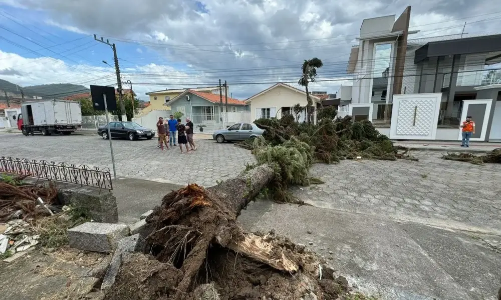 Os fortes ventos registrados na manhã desta quinta-feira, dia 21 de março, em Tubarão, derrubaram uma árvore na rua Almir dos Santos Miranda, no bairro Morrotes.