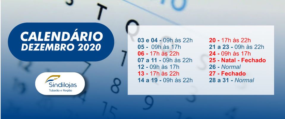 O Sindilojas (Sindicato do Comércio Varejista de Tubarão e Região) definiu na última semana a programação especial de natal deste ano de 2020. De acordo com o calendário, o setor atenderá em horário estendido a partir do dia 3 de dezembro.