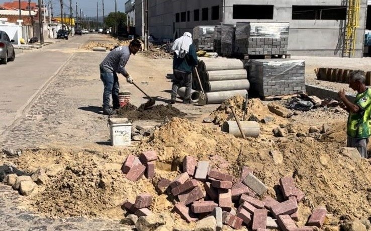 Nesta semana, a Secretaria de Obras deu início à instalação do sistema de drenagem. Todas as lajotas que estão sendo retiradas serão reutilizadas em outras vias do bairro.