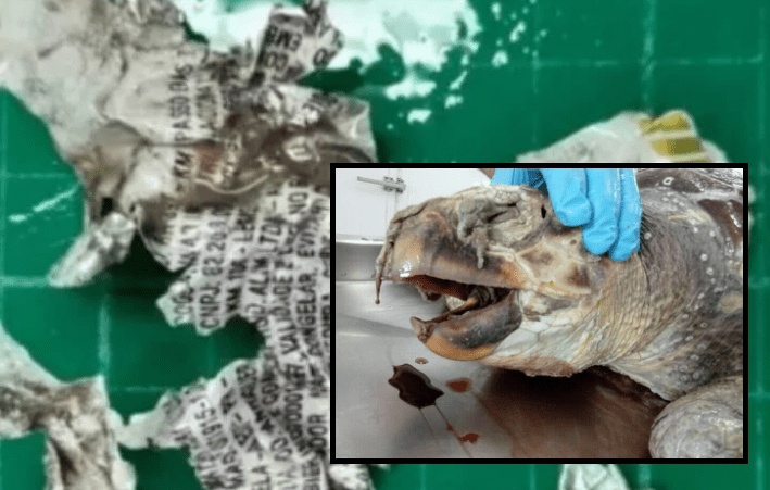 A suspeita dos pesquisadores e de que a lata tenha sido o motivo da morte da tartaruga, ainda sem espécie confirmada.