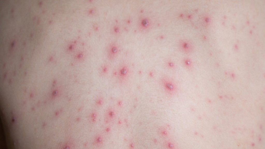 Entre os sintomas mais comuns da doença, estão: Erupções cutâneas, em 93,9% dos casos; febre, em 48,5% deles; seguido de dor de cabeça; mialgia e dor de garganta. A transmissão entre os humanos acontece, principalmente, por contato pessoal com secreções respiratórias, lesões de pele ou objetos contaminados.