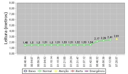 O índice do rio, que até às 7h12 (2,41m) era considerado “normal”, agora passa a ser de “atenção”. O nível em relação ao mar mar aumentou 20 centímetros em pouco mais de 15 minutos.