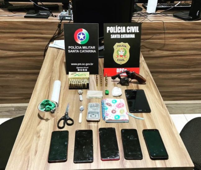 Entre os objetos apreendidos na residência do investigado, localizada no bairro Nova Brasília, estão um revólver calibre .38; 48 munições calibre .38; seis munições calibre .40; 10 munições calibre 9mm; 39,7g de cocaína; 7,5g de maconha; um comprimido de ecstasy; uma balança de precisão; cinco aparelhos celulares; um tablet; anotações relacionadas ao tráfico de drogas; e também materiais usados para embalar e fracionar os ilícitos.