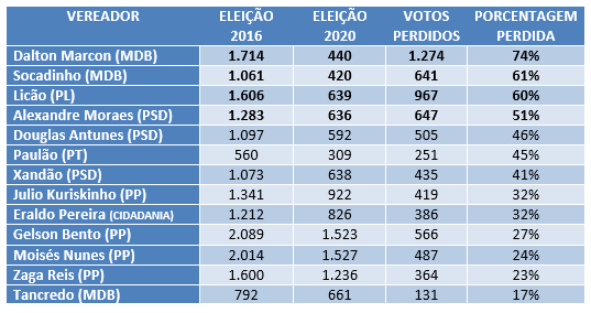 Embora tenha sido uma eleição atípica, muitos dos favoritos à reeleição se perderam no caminho. Para se ter uma noção, Dalton Marcon (MDB), Socadinho (MDB), Licão (PL) e Alexandre Moraes (PSD), lideram o ranking da perda de votos. Comparado ao pleito de 2016, ambos perderam mais da metade dos votos. Observe: