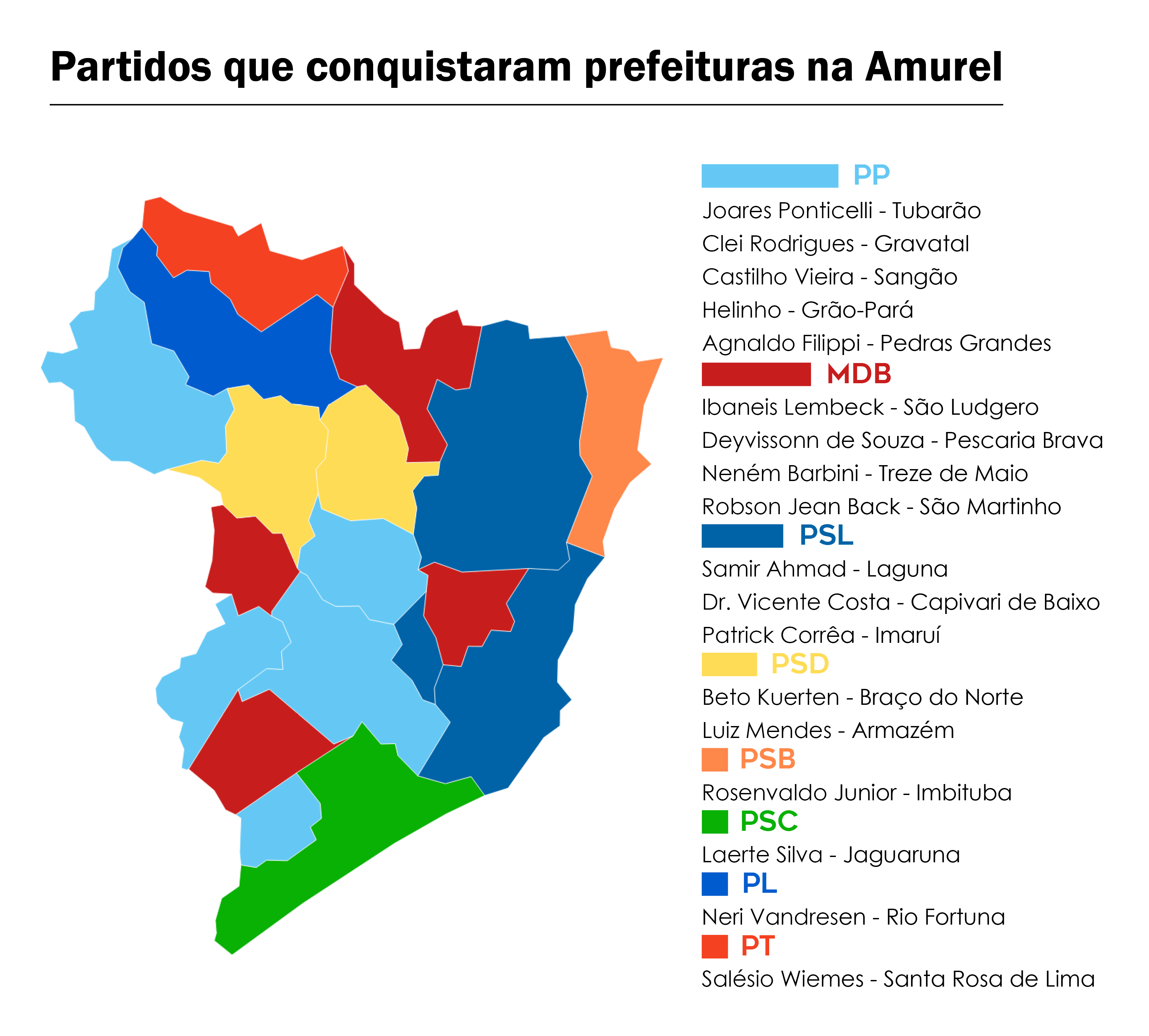 O PSL estreia na Amurel conquistando três prefeituras. Samir Ahmad, em Laguna; Vicente Costa, em Capivari de Baixo; e Patrick Corrêa, em Imaruí, serão os representantes do partido do governador Carlos Moisés e pelo qual o presidente Jair Bolsonaro se elegeu. O PSL passará a ser o terceiro em número de prefeitos na região.