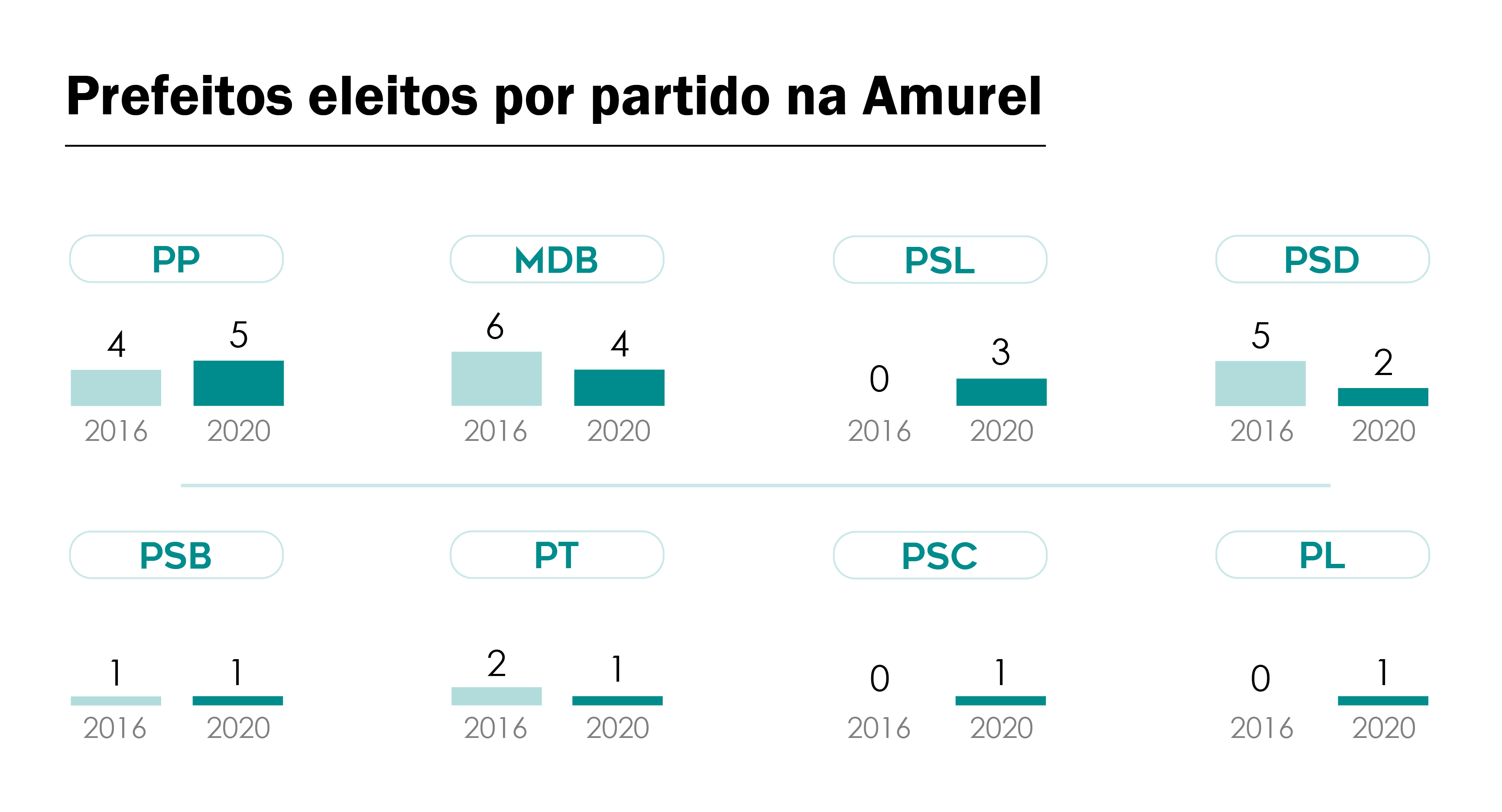 O resultado das eleições municipais do último domingo, 15, trouxe uma mudança no mapa dos partidos que ocupam as prefeituras da Amurel. Oito legendas vão administrar os municípios da região, sendo que o PP e o MDB se mantiveram como as siglas com a maior quantidade de prefeitos eleitos.