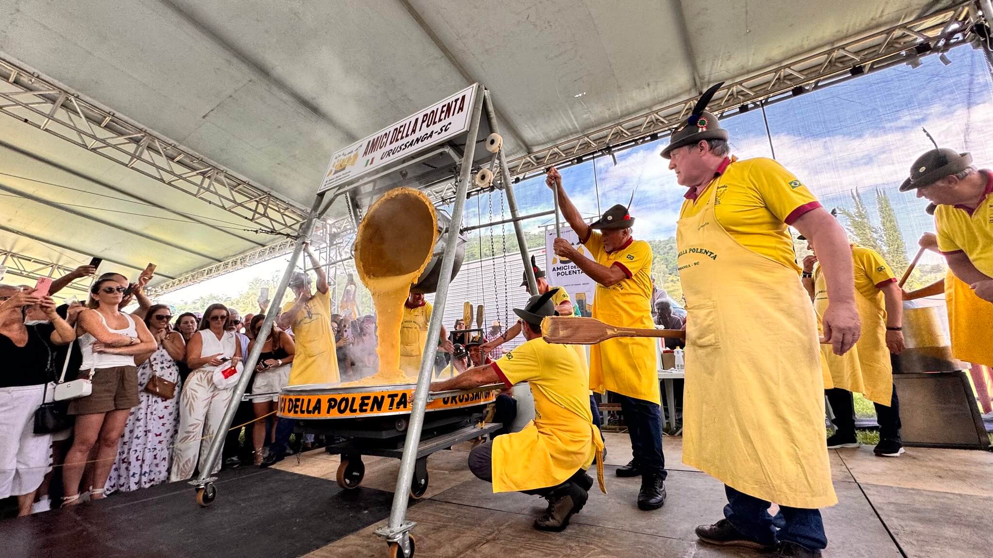 Um dos momentos mais vibrantes foi, mais uma vez, o tradicional Tombo da Polenta, que reuniu uma multidão no Centro Cultural Bertino Felippe, em Azambuja. “Foi uma festa inesquecível, que mostrou o quanto nossa cidade valoriza sua história e projeta seu futuro com orgulho”, afirmou Agnaldo Filippi.