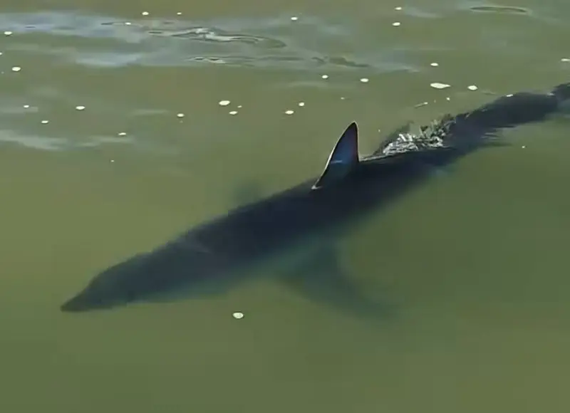 Imagens e vídeos registrados no momento mostram claramente a barbatana do animal surgindo acima da superfície da água.