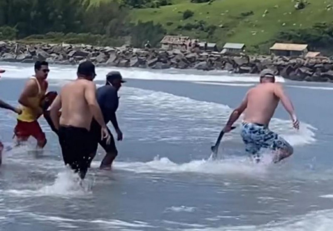 O tubarão foi resgatado e devolvido ao mar por guarda-vidas e um pescador.