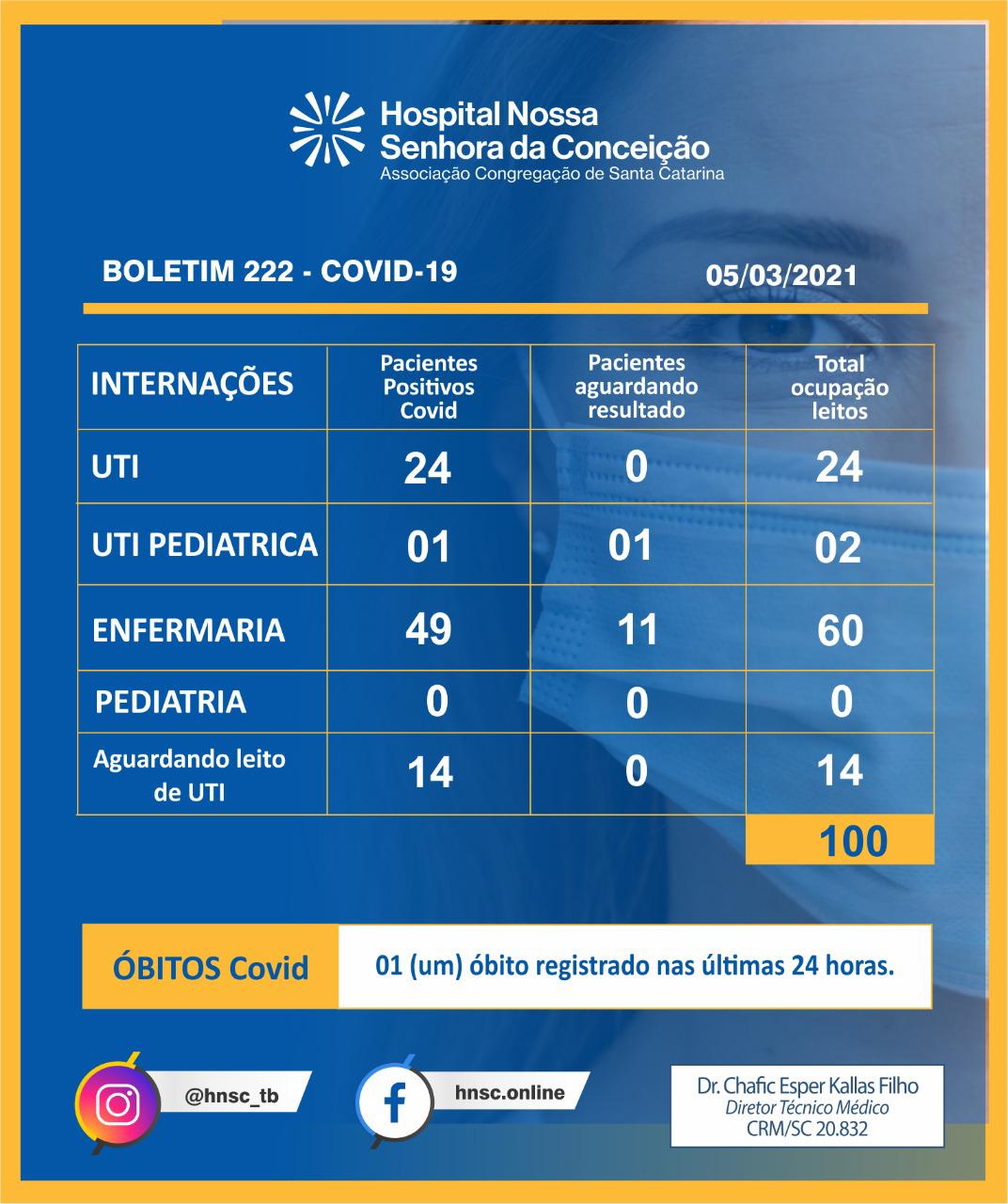 O Hospital Nossa Senhora da Conceição (HNSC), de Tubarão, informou nesta sexta-feira, 5 de março, que não há mais leitos para internação disponíveis na unidade, seja para pacientes que necessitem de tratamento em Unidade de Terapia Intensiva (UTI) ou enfermaria.