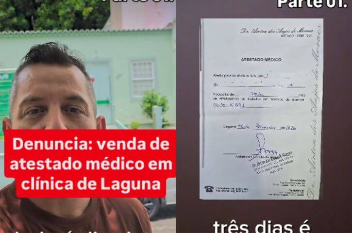 Uma denúncia sobre a suposta venda de atestados médicos em um consultório particular de Laguna ganhou repercussão nesta terça-feira, 6 de janeiro, após a divulgação de vídeos nas redes sociais pelo empresário Patrik Paulino, proprietário do Supermercado NOVO. Segundo ele, o documento teria sido comercializado pelo valor de R$ 125, em uma clínica localizada no Centro Histórico do município.
