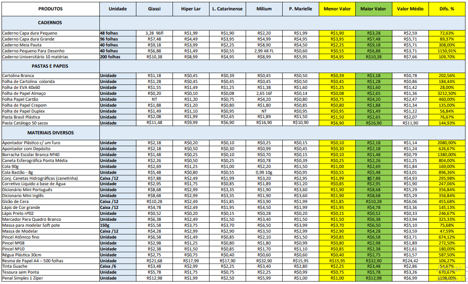 Ao todo, cinco estabelecimentos foram conferidos entre os dias 14 e 19 deste mês de janeiro. O levantamento levou em consideração os itens mais pedidos nas listas de material escolar enviadas por algumas instituições de ensino.
